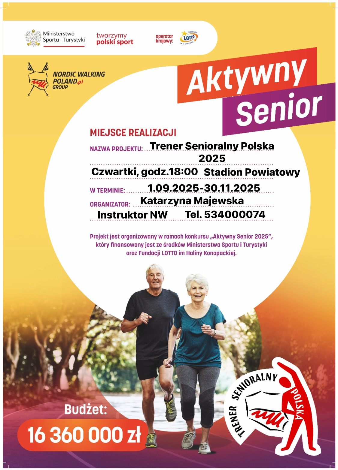 Projekt jest organizaowany w ramach konkursu "Aktywny Senior 2025", który finansowany jest ze środków Ministerstwa Sportu i Turystyki oraz Fundacji LOTTO im Haliny Konopackiej.