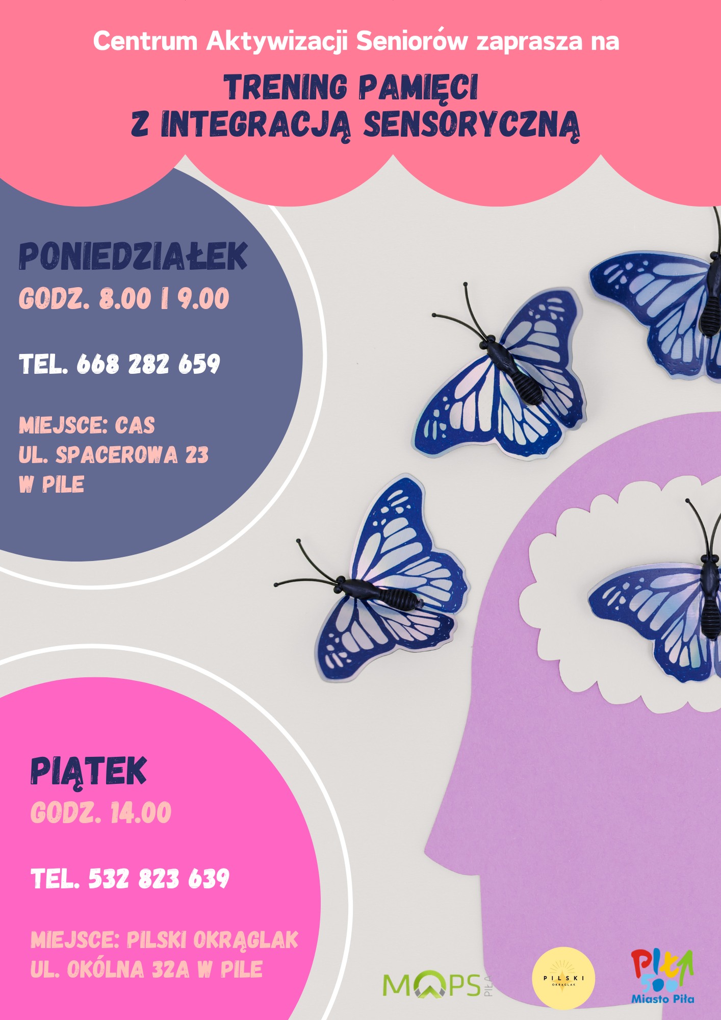 Trening pamięci z integracją sensoryczną; Centrum Aktywizacji Seniorów, ul. Spacerowa 23; Każdy poniedziałek, godz. 8:00 i 9:00; Zapisy: tel. 668 282 659.