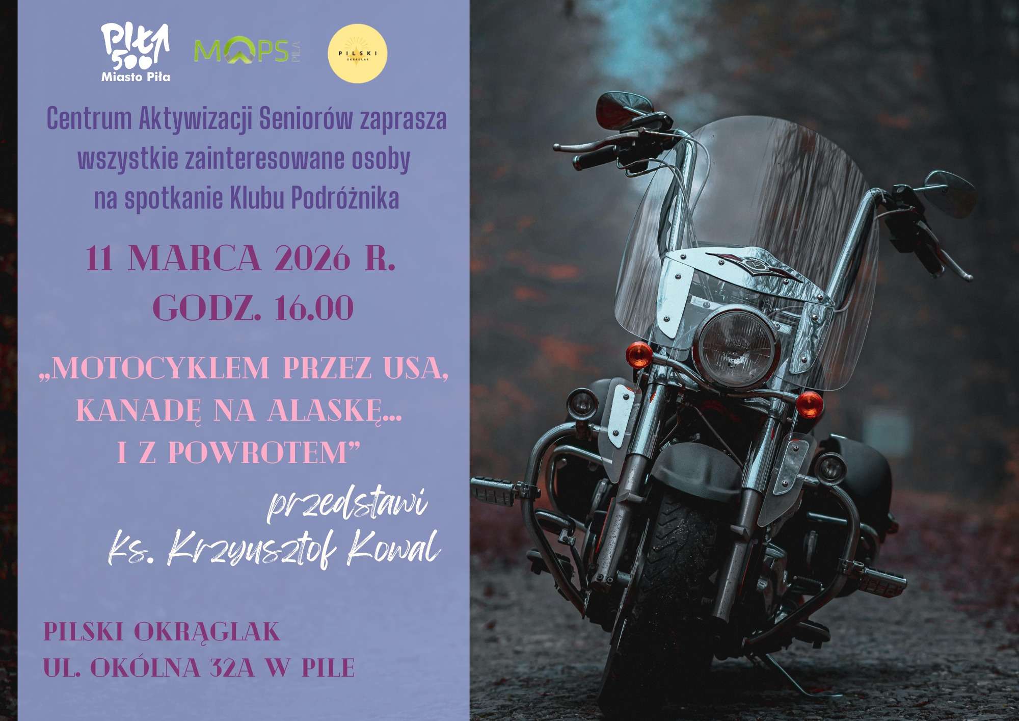 Klub Podróżnika|Motocyklem przez USA, Kanadę na Alaskę... i z powrotem; Pilski Instytut Integracji Edukacji "Okrąglak", ul. Okólna 32A; środa 11 marca 2026 r., godz. 16:00; Wszystkich zainteresowanych serdecznie zapraszamy.