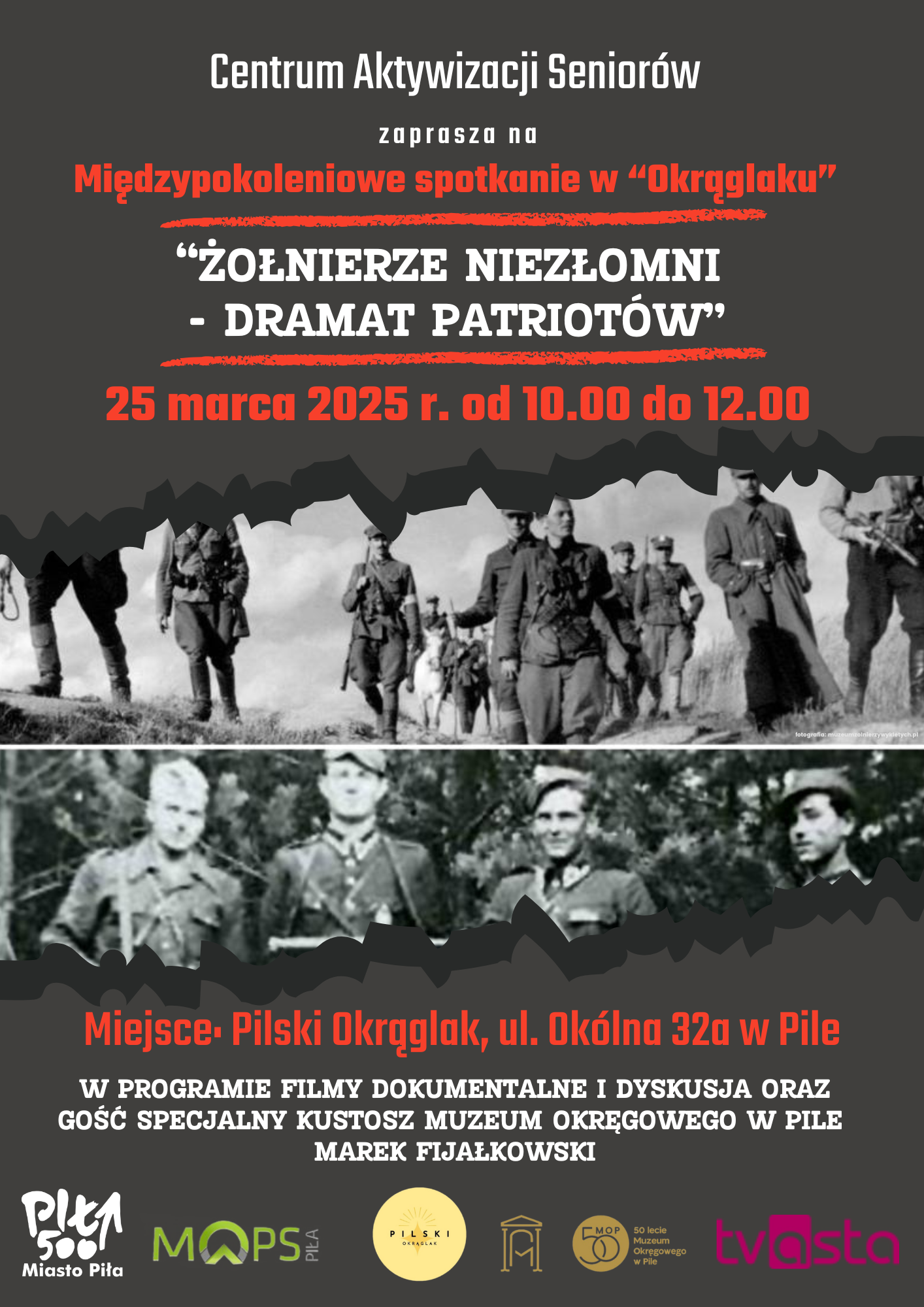 Żołnierze Niezłomni – Dramat patriotów; Pilski Instytut Integracji i Edukacji „Okrąglak”, ul. Okólna 32A; 25 marca 2025 r., godz. 10:00; Spotkanie w ramach integracji międzypokoleniowej, podczas którego zaprezentujemy dwa krótkie filmy dokumentalne, po emisji których zapraszamy do dyskusji z ekspertem Panem Markiem Fijałkowskim, starszym kustoszem Muzeum Okręgowego w Pile.